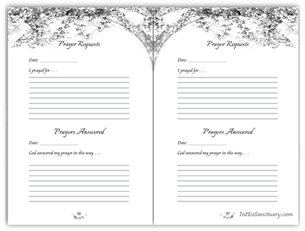 Keeping a record of your prayer requests and answers to those prayers is an essential part of the journey toward intimacy with God. Alone with God in His Sanctuary contains several prayer request pages like these: